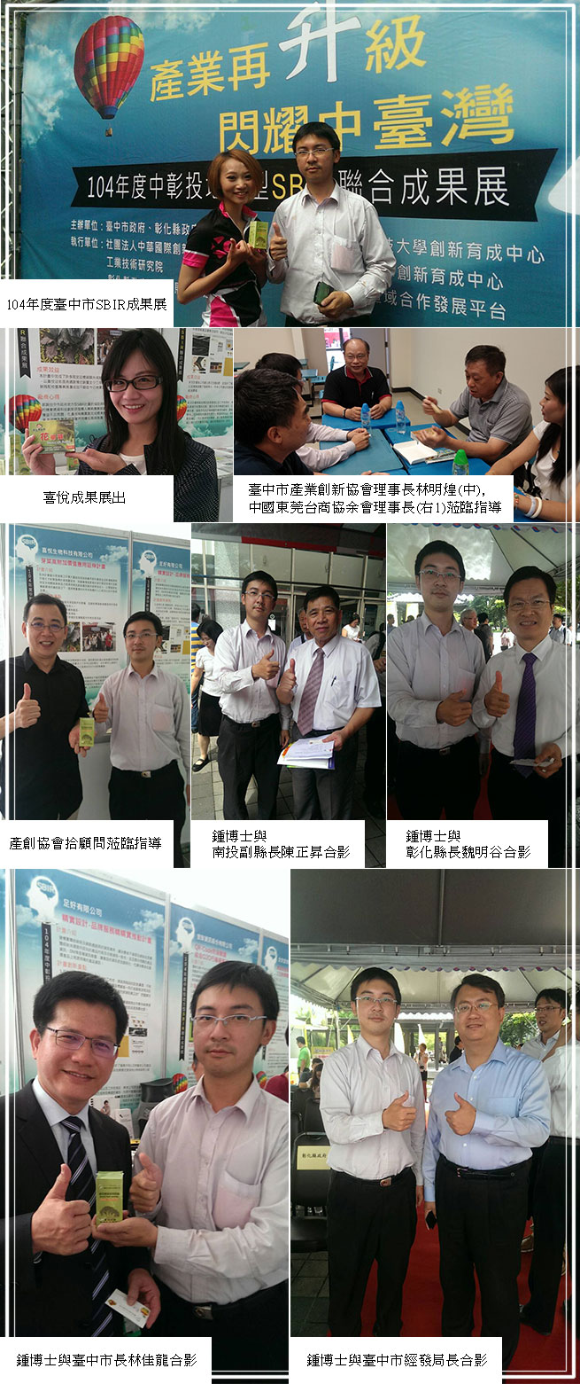 104年度臺中市SBIR逢甲成果展 2015,09,07 臺中市彰化縣南投縣共同舉辦 喜悅104年度臺中市SBIR逢甲成果展 2015年9月4日喜悅展出綠花椰菜芽萃取系列及新產品紫高麗菜芽萃取研發成果受到各界肯定!! 我們將繼續努力創造有機新生活,為國人健康努力! 上一則 回最新消息總覽頁 下一則