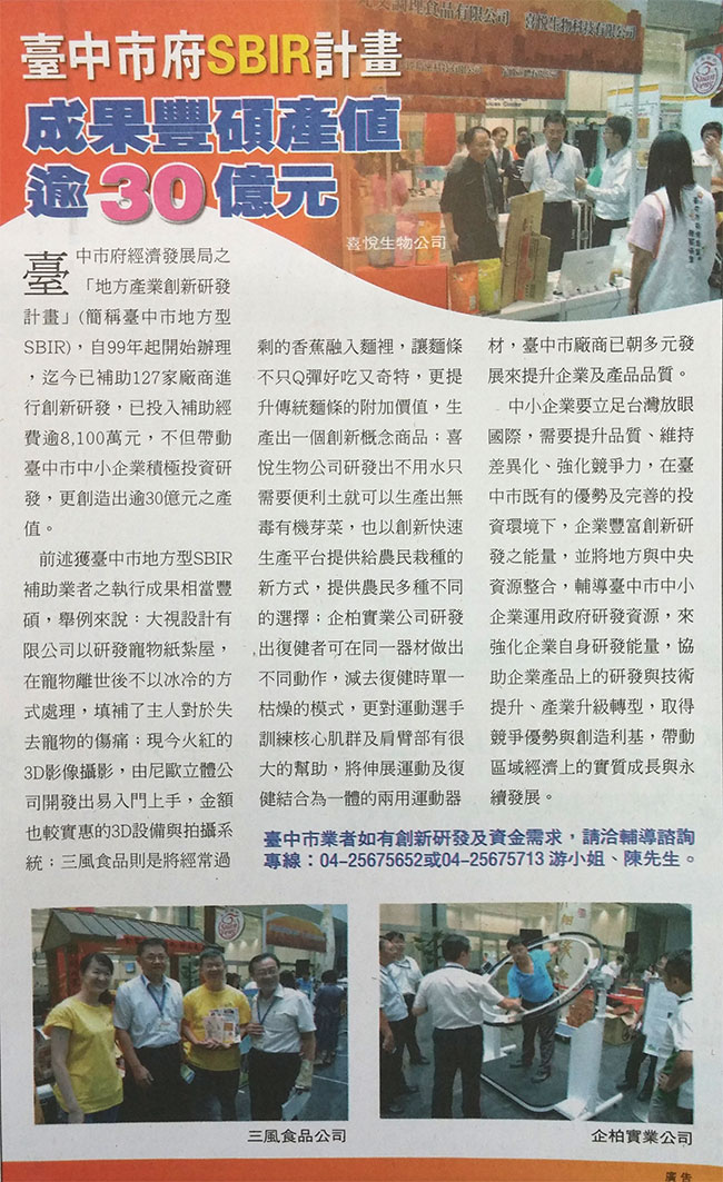 臺中市府SBIR計劃 成果豐碩 經濟日報 2014,08,03 感謝經濟日報 於 中華民國103年8月3日報導臺中市府SBIR計劃 成果豐碩 喜悅生技創新研發 EasyGrow便利土 (快速生產平台) 上一則 回報紙媒體總覽頁 下一則